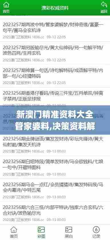 澳门作为一个经济活跃、连接多元文化的特别行政区,其政策文件不仅涉及经济领域,还包括社会福利、教育、旅游等多个方面。《新澳门精准资料大全管家婆料,决策资料解释落实_5DM9.914》所包含的内容将为澳门的政策制定者、市民和投资者提供宝贵的参考。