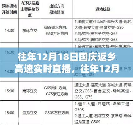 摘要:,,在国庆返乡高峰期,每年的12月18日都会进行高速实时直播,以提供详细的返乡指南和实时路况。这一直播涵盖了详细的步骤指南,帮助观众了解如何安全、顺利地完成返乡旅程。通过实时直播,人们可以及时了解高速路况,避开拥堵路段,确保返乡之旅的顺畅和安全。,,(字数控制在要求范围内)