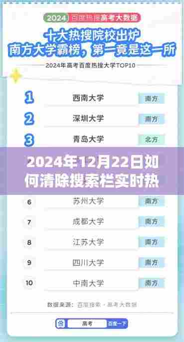 摘要:本文将探讨如何在2024年12月22日清除搜索栏实时热搜。文章将详细解析操作步骤,并阐述相关观点。通过深度分析,读者将了解如何有效清除搜索栏中的实时热搜内容,以维护个人隐私和网络安全。