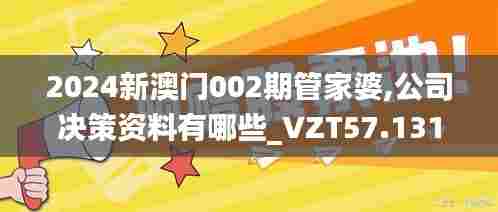 在中国这个经济飞速发展的国家,澳门作为其中的一个特别行政区,不仅在旅游和娱乐领域有着举足轻重的地位,同时也因其独特的管理系统受到广泛关注。本文将围绕"2024新澳门002期管家婆"这一主题,深入探讨公司在决策过程中所依赖的各种资料,以及VZT57.131挑战版如何为公司提供有力的支持和帮助。
