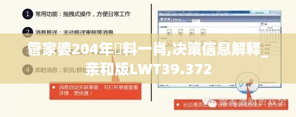 在大数据时代,数据已经成为企业最宝贵的资产之一。尤其在竞争激烈的市场环境下,如何利用好数据资源,为企业提供科学的决策依据,已经成为企业生存和发展的关键。"管家婆204"作为一家专业的大数据处理公司,自成立之初就致力于为客户提供准确、快速、专业的大数据分析服务。而“一肖资料”则是我们的核心产品之一,其在决策信息解释、亲和版LWT39.372中具有关键性的作用。