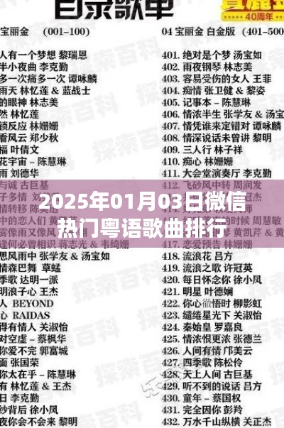 通过以上介绍,我们了解了2025年1月3日微信热门粤语歌曲排行,这些歌曲以其独特的魅力吸引了众多歌迷的喜爱,展现了粤语歌曲的独特魅力,随着数字音乐的发展,我们相信粤语歌曲将继续传承与创新,为歌迷带来更多精彩的音乐作品,让我们共同期待粤语歌曲的未来发展,感受音乐带来的美好与快乐。