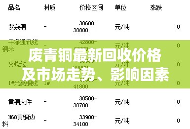 综合来看,废青铜的回收价格受到全球经济、原材料价格、政策法规、市场需求等多种因素的影响,投资者在关注废青铜回收价格时,需要全面考虑这些因素,随着环保和资源再利用的重视程度不断提高,废青铜的回收市场将迎来更多的发展机遇。