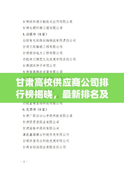 随着教育行业的快速发展,甘肃省的高校供应商市场也在不断扩大,许多供应商公司凭借优质的服务和产品质量,在市场中脱颖而出,以下是对甘肃高校供应商公司的排名,以供参考。