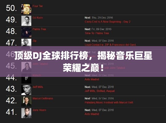 顶级DJ的成长历程并非一帆风顺,他们通过不断的努力和学习,提升自己的音乐技巧和表演能力,他们经历了无数的挑战和困难,但凭借对音乐的热爱和对成功的渴望,他们最终登上了顶级DJ的宝座,他们的成功并非偶然,而是他们付出努力的结果。