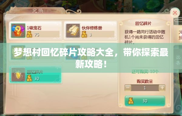 亲爱的玩家们,你们好!今天我们将一起探索那个充满回忆与梦想的神秘地方——梦想村,本篇文章将为你带来“梦想村回忆碎片”的最新攻略,助你轻松收集所有回忆碎片,解锁隐藏任务,赢取丰厚奖励。