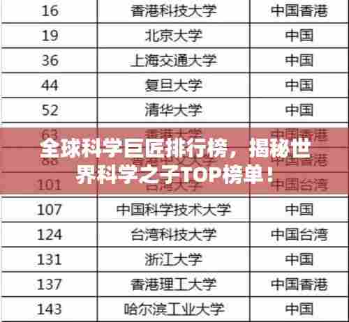 科学是人类探索世界、认识自然的重要工具,也是推动人类文明进步的重要力量,在世界科学的舞台上,有许多杰出的科学家以其卓越的成就和贡献成为了人们心中的科学之子,本文将介绍世界科学之子的排名,介绍他们在科学领域的杰出成就和贡献。