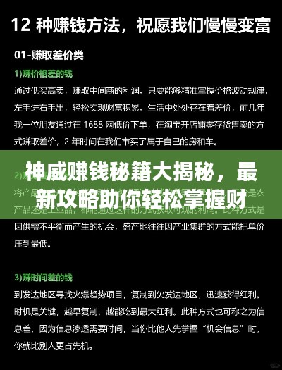 “神威赚钱攻略最新”不仅仅是一篇文章,更是一份指引你走向成功的指南,掌握最新的赚钱技巧和方法,结合自身实际情况,勇敢迈出第一步,你也能实现财富增长,希望本文能为你带来启发和帮助,祝你在赚钱的路上越走越远!
