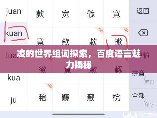 “凌”的组词展现了汉语表达的丰富性和多样性,通过百度搜索,我们可以轻松找到关于“凌”的多种组词方式,了解其在不同语境下的应用,这些组词不仅帮助我们更好地理解和使用“凌”字,还让我们领略到汉语的独特魅力,在今后的学习和工作中,我们可以充分利用搜索引擎,探索更多关于汉字的知识,丰富我们的语言表达。