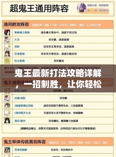 随着游戏版本的更新,鬼王的打法也在不断变化,本文将为大家带来鬼王的最新打法攻略图,帮助大家更好地掌握鬼王的技能、装备选择和战术运用,从而在游戏中取得优势。