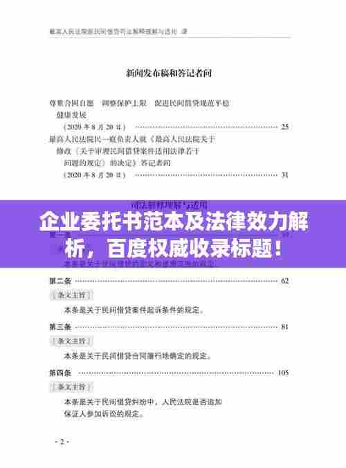 企业委托书是企业之间或企业内部的一种法律文件,用以明确授权代表企业或企业某部门处理特定事务的权限和责任,当企业需要委托他人代为办理某些事务时,便需用到企业委托书,通过百度搜索“企业委托书”,您可以找到各种范本和示例,以便更好地了解其内容。