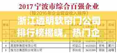 随着社会的快速发展,透明软帘门在浙江地区的应用越来越广泛,因其独特的优势,如透光性好、柔软耐用、易于清洁等,透明软帘门在市场上受到广大用户的青睐,本文将介绍浙江地区透明软帘门公司的排名,以便用户更好地了解并选择优质的服务。