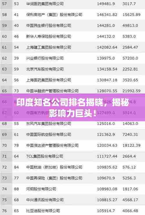 印度,这个古老国度正经历着前所未有的经济转型,成为全球商业领域的重要力量,随着科技的飞速发展,印度众多公司崭露头角,成为国内外瞩目的焦点,本文将为您介绍印度知名公司的排名及其影响力。