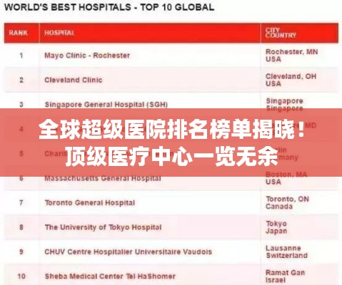 转载请注明来自浙江大溪洋泵业制造有限公司,本文标题:《全球超级医院排名榜单揭晓!顶级医疗中心一览无余》