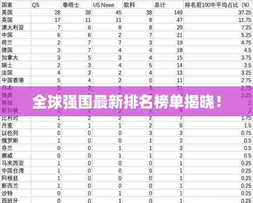 随着全球政治、经济、科技等领域的不断变化,世界各国的综合实力也在不断发展变化,在此,我们根据最新的数据和信息,对全球强国的排名进行梳理和探讨,本文所列排名仅供参考,实际排名可能因各种因素而有所变化。