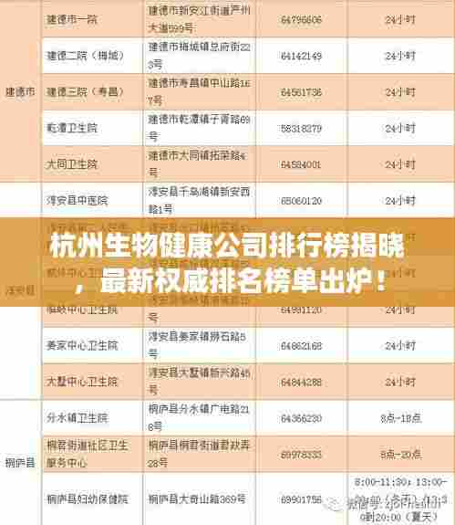 杭州,这座美丽的城市不仅是中国的经济强市,也是生物健康产业的重要基地,随着科技的飞速发展,杭州的生物健康产业日益壮大,众多企业崭露头角,本文将为您揭晓杭州生物健康公司的排名榜,带您了解这一领域的佼佼者。