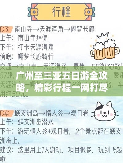 这是一场从广州到三亚的美丽旅行,总时长为五天,你将在这短暂的时光里,领略到三亚的热带风情和广州的都市魅力。
