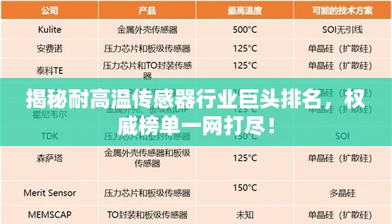 随着工业领域的快速发展,耐高温传感器作为关键设备之一,其需求日益增长,本文将介绍全球范围内耐高温传感器公司的排名,以便用户更好地了解市场现状和选择合作伙伴。