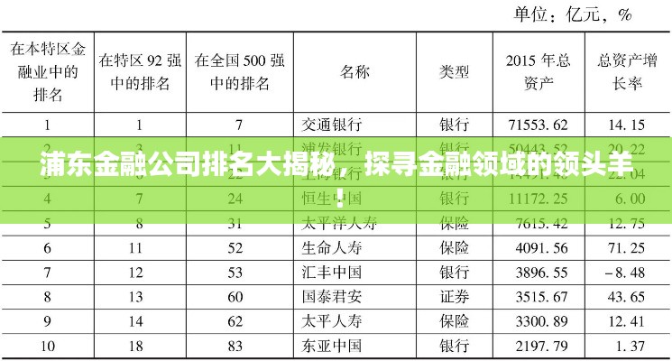 随着全球经济的蓬勃发展,金融业在各地的经济体系中占据了举足轻重的地位,作为中国金融业的开放前沿,上海浦东地区的金融公司在国内外享有盛誉,本文将为您揭示浦东金融公司的排名,带您一探这些金融领域的佼佼者。