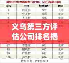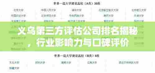 随着义乌市场的日益繁荣和多样化,第三方评估公司在该地区的角色愈发重要,它们以客观、公正、专业的角度,为企业提供各类评估服务,助力企业稳健发展,本文将探讨义乌第三方评估公司的排名及其行业影响力。