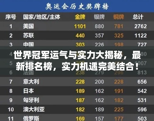 近年来,随着全球体育竞技的日益激烈,各大赛事中涌现出众多优秀的运动员和团队,在这些运动员和团队的成功背后,除了实力和努力,运气也是一个不可忽视的因素,我们结合最新的世界冠军运气排名榜,来探讨实力与机遇的完美结合。