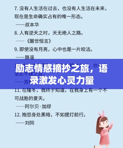 在这个纷繁喧嚣的世界里,我们时常需要一些励志的话语来激励自己前行,情感文章中的励志语录,犹如一盏明灯,照亮我们前行的道路,以下是摘自情感文章的励志语录,希望能给你带来正能量和动力。