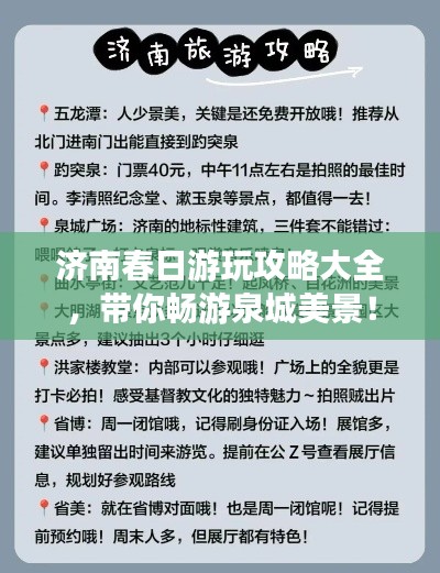 春天的济南,万物复苏,气候宜人,是旅游的最佳时节,这座拥有悠久历史的城市,不仅有着美丽的自然风光,还有众多的人文景观,本篇攻略将带您领略济南春日的魅力,安排一场精彩的旅程。