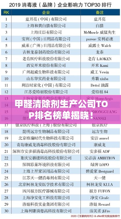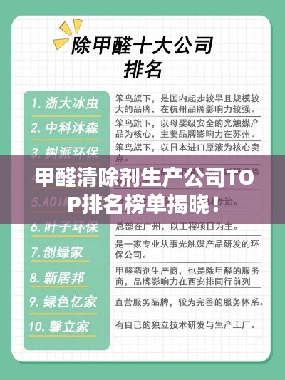随着人们对室内环境质量的关注度不断提高,甲醛污染问题愈发受到重视,甲醛清除剂作为一种能有效降低室内甲醛浓度的产品,其市场需求日益增长,本文将介绍甲醛清除剂生产公司的排名,以便消费者了解并选择优质的产品和服务。