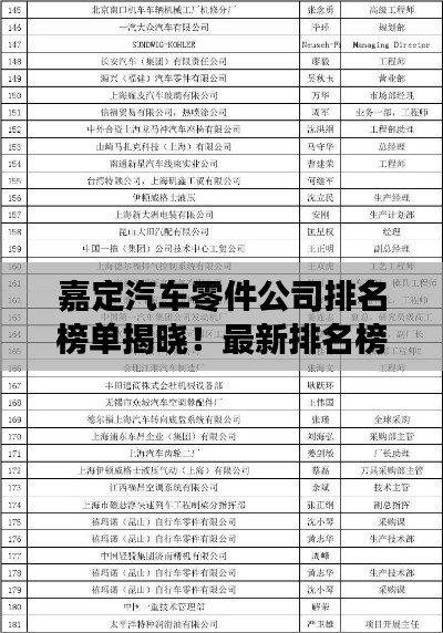 随着汽车产业的飞速发展,汽车零件行业也迎来了前所未有的发展机遇,在嘉定地区,众多汽车零件公司凭借卓越的技术实力、优质的产品质量以及良好的市场口碑脱颖而出,形成了竞争激烈的汽车零件行业格局,本文将为您介绍嘉定汽车零件公司的排名榜,带您了解这些企业的实力与风采。