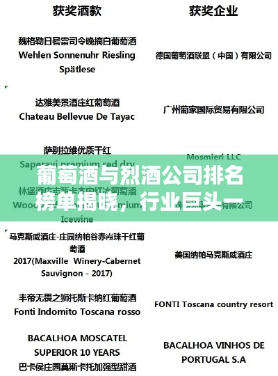 在全球酒类市场中,葡萄酒和烈酒是最受欢迎的两大品类,随着消费者的口味日益多样化,葡萄酒与烈酒市场不断扩大,各大公司也在竞争中不断创新和发展,本文将对全球范围内的葡萄酒与烈酒公司进行一次排名,以展示这些企业的实力和影响力。