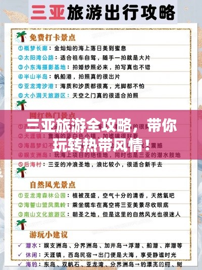 通过这篇攻略,希望你对三亚旅游有了更全面的了解,在计划前往三亚旅行时,务必提前做好准备,包括了解景点、美食、购物、注意事项、交通和住宿等方面,祝你有一个愉快的三亚之旅!