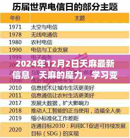 生活就像一场奇妙的旅行,我们不断探寻、学习、成长,天麻新信息为我们提供了认识世界的窗口,让我们在变化中找到力量,在挑战中培养自信,让我们一起迎接2024年12月2日的挑战,与天麻一起成长,用自信书写属于我们的辉煌人生!