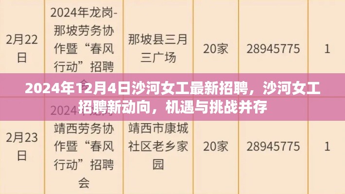 随着时代的变迁和经济的发展,劳动力市场的动态也在不断变化。“2024年12月4日沙河女工最新招聘”成为热议话题,这不仅是一次简单的招聘活动,更是社会经济发展中的一个缩影,反映了当下劳动力市场的新变化与趋势,本文将围绕这一主题展开论述,探讨其背后的机遇与挑战。