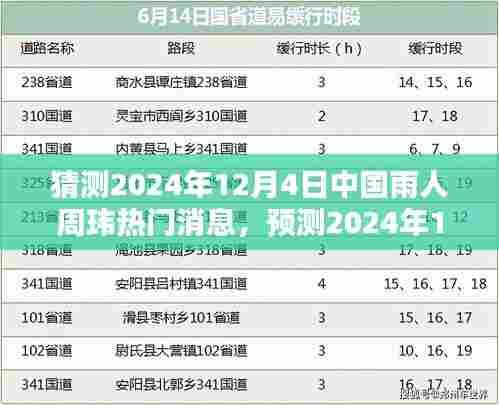 随着时代的进步和科技的发展,人们对于各类信息的关注度日益提高,特别是在数字化信息时代,各种新闻、资讯的更新速度之快令人惊叹,在这样的背景下,作为一位备受瞩目的公众人物,周玮先生的每一条消息都牵动着广大公众的心,本文将围绕“猜测2024年12月4日中国雨人周玮热门消息”这一主题,对可能的热点进行深度解析,重点关注要点一、要点二和要点三。