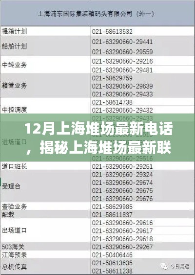 摘要:最新消息,上海堆场联系方式已更新,提供最新的电话号码。想要了解上海堆场的最新信息,请拨打最新电话,我们将为你揭秘上海堆场的最新联系方式。此更新版信息于12月发布,确保你能够及时获取最新的联系方式。