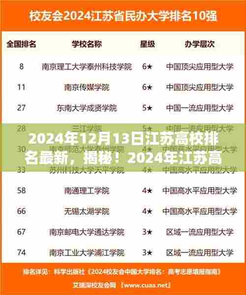 摘要:最新消息,江苏高校排名榜单于2024年12月13日更新发布。这份排名榜单揭示了江苏省内各大高校的最新排名情况,包括众多知名学府。你心仪的学校是否荣登榜单?快来了解最新排名情况,看看江苏省内高校的综合实力和学术声誉。